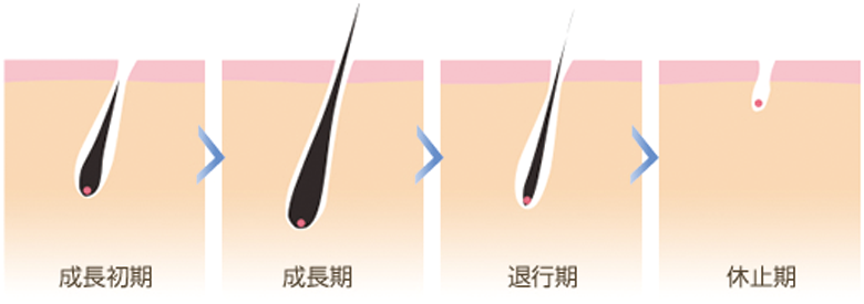 体毛には「成長期」「退行期」「休止期」と呼ばれる毛周期があります。毛の一本一本がこの周期を持っていて生まれ変わりを繰り返しています。医療レーザー脱毛のレーザーは、毛の黒い色(メラニン色素)に反応して、脱毛を行うため、「退行期」「休止期」の状態の体毛に対しては脱毛効果が低くなってしまいます。